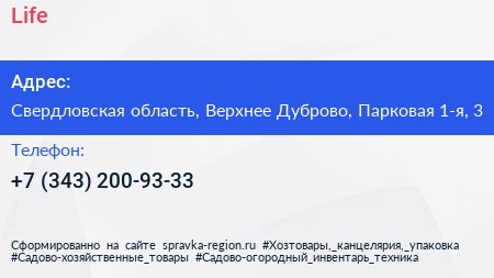 Life по адресу Свердловская область, Верхнее Дуброво, Парковая 1-я, 3 в дальнейшем Организация, размещена в следующих категориях:
