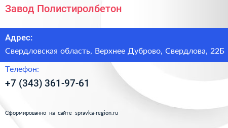 Завод Полистиролбетон по адресу Свердловская область, Верхнее Дуброво, Свердлова, 22Б в дальнейшем Организация, размещена в следующих категориях: