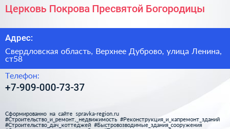 Церковь Покрова Пресвятой Богородицы по адресу Свердловская область, Верхнее Дуброво, улица Ленина, ст58 в дальнейшем Организация, размещена в следующих категориях: