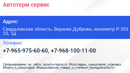 Автотерм-сервис+ по адресу Свердловская область, Верхнее Дуброво, километр Р-351 33, 1д в дальнейшем Организация, размещена в следующих категориях:
