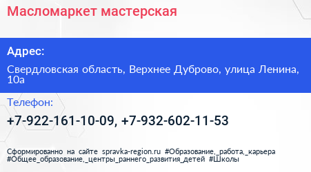 Масломаркет, мастерская по адресу Свердловская область, Верхнее Дуброво, улица Ленина, 10а в дальнейшем Организация, размещена в следующих категориях: