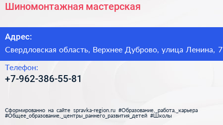 Шиномонтажная мастерская по адресу Свердловская область, Верхнее Дуброво, улица Ленина, 7 в дальнейшем Организация, размещена в следующих категориях: