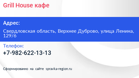 Grill-House, кафе по адресу Свердловская область, Верхнее Дуброво, улица Ленина, 129/6 в дальнейшем Организация, размещена в следующих категориях: