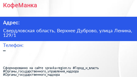 КофеМанка по адресу Свердловская область, Верхнее Дуброво, улица Ленина, 129/1 в дальнейшем Организация, размещена в следующих категориях: