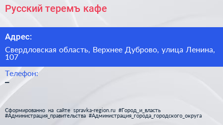 Русский теремъ, кафе по адресу Свердловская область, Верхнее Дуброво, улица Ленина, 107 в дальнейшем Организация, размещена в следующих категориях: