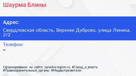 Шаурма & Блины по адресу Свердловская область, Верхнее Дуброво, улица Ленина, 2/2 в дальнейшем Организация, размещена в следующих категориях: