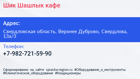 Шик Шашлык, кафе по адресу Свердловская область, Верхнее Дуброво, Свердлова, 13а/3 в дальнейшем Организация, размещена в следующих категориях: