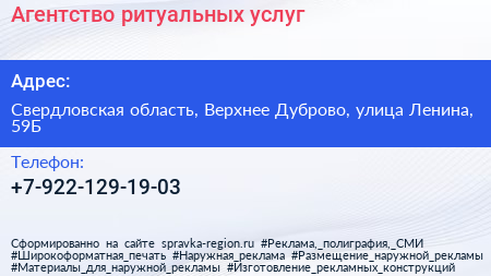 Агентство ритуальных услуг по адресу Свердловская область, Верхнее Дуброво, улица Ленина, 59Б в дальнейшем Организация, размещена в следующих категориях: