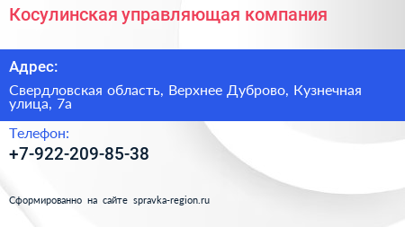 Косулинская управляющая компания по адресу Свердловская область, Верхнее Дуброво, Кузнечная улица, 7а в дальнейшем Организация, размещена в следующих категориях: