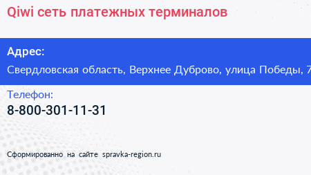 Qiwi, сеть платежных терминалов по адресу Свердловская область, Верхнее Дуброво, улица Победы, 7 в дальнейшем Организация, размещена в следующих категориях: