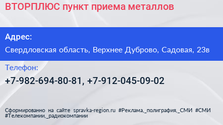 ВТОРПЛЮС, пункт приема металлов по адресу Свердловская область, Верхнее Дуброво, Садовая, 23в в дальнейшем Организация, размещена в следующих категориях: