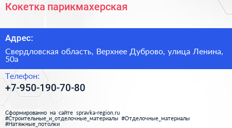 Кокетка, парикмахерская по адресу Свердловская область, Верхнее Дуброво, улица Ленина, 50а в дальнейшем Организация, размещена в следующих категориях: