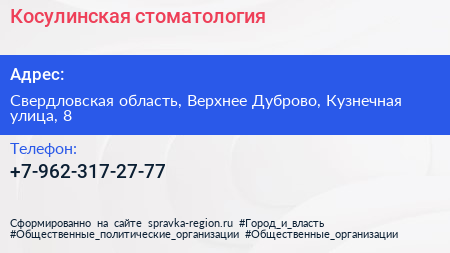 Косулинская стоматология по адресу Свердловская область, Верхнее Дуброво, Кузнечная улица, 8 в дальнейшем Организация, размещена в следующих категориях: