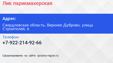 Лик, парикмахерская по адресу Свердловская область, Верхнее Дуброво, улица Строителей, 6 в дальнейшем Организация, размещена в следующих категориях: