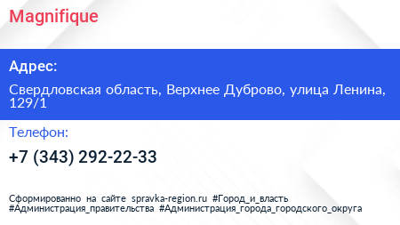 Magnifique по адресу Свердловская область, Верхнее Дуброво, улица Ленина, 129/1 в дальнейшем Организация, размещена в следующих категориях: