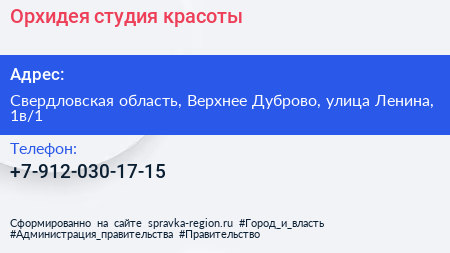 Орхидея, студия красоты по адресу Свердловская область, Верхнее Дуброво, улица Ленина, 1в/1 в дальнейшем Организация, размещена в следующих категориях: