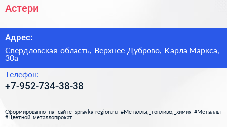 Астери по адресу Свердловская область, Верхнее Дуброво, Карла Маркса, 30а в дальнейшем Организация, размещена в следующих категориях: