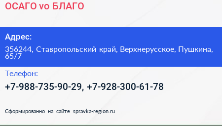 ОСАГО vo БЛАГО по адресу 356244, Ставропольский край, Верхнерусское, Пушкина, 65/7 в дальнейшем Организация, размещена в следующих категориях: