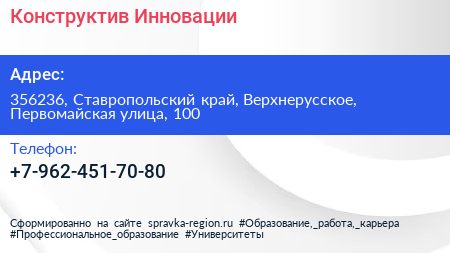 Конструктив Инновации по адресу 356236, Ставропольский край, Верхнерусское, Первомайская улица, 100 в дальнейшем Организация, размещена в следующих категориях: