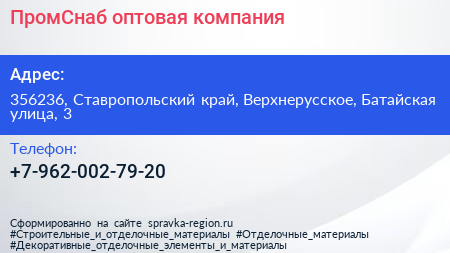 ПромСнаб, оптовая компания по адресу 356236, Ставропольский край, Верхнерусское, Батайская улица, 3 в дальнейшем Организация, размещена в следующих категориях: