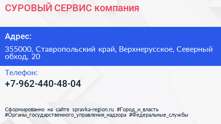 СУРОВЫЙ-СЕРВИС, компания по адресу 355000, Ставропольский край, Верхнерусское, Северный обход, 20 в дальнейшем Организация, размещена в следующих категориях: