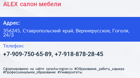 ALEX, салон мебели по адресу 356245, Ставропольский край, Верхнерусское, Гоголя, 24/3 в дальнейшем Организация, размещена в следующих категориях: