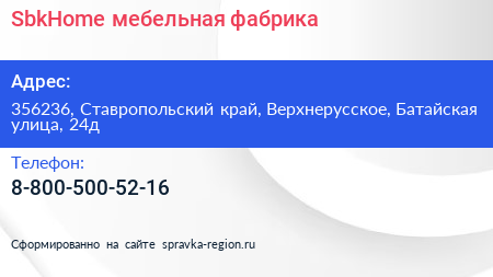 SbkHome, мебельная фабрика по адресу 356236, Ставропольский край, Верхнерусское, Батайская улица, 24д в дальнейшем Организация, размещена в следующих категориях: