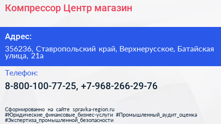 Компрессор-Центр, магазин по адресу 356236, Ставропольский край, Верхнерусское, Батайская улица, 21а в дальнейшем Организация, размещена в следующих категориях: