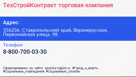 ТехСтройКонтракт, торговая компания по адресу 356236, Ставропольский край, Верхнерусское, Первомайская улица, 98 в дальнейшем Организация, размещена в следующих категориях: