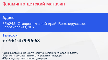 Фламинго, детский магазин по адресу 356245, Ставропольский край, Верхнерусское, Георгиевская, 107 в дальнейшем Организация, размещена в следующих категориях: