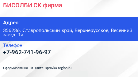 БИСОЛБИ-СК, фирма по адресу 356236, Ставропольский край, Верхнерусское, Весенний заезд, 1а в дальнейшем Организация, размещена в следующих категориях: