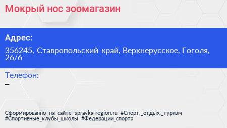 Мокрый нос, зоомагазин по адресу 356245, Ставропольский край, Верхнерусское, Гоголя, 26/6 в дальнейшем Организация, размещена в следующих категориях: