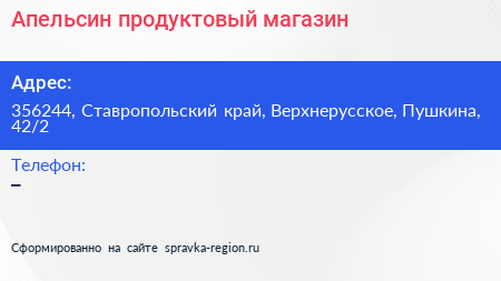 Апельсин, продуктовый магазин по адресу 356244, Ставропольский край, Верхнерусское, Пушкина, 42/2 в дальнейшем Организация, размещена в следующих категориях: