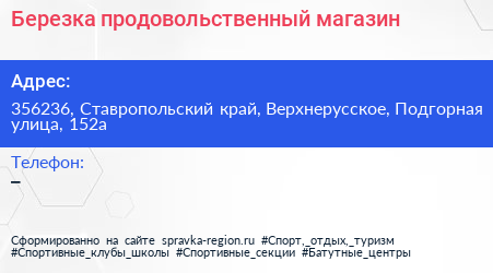 Березка, продовольственный магазин по адресу 356236, Ставропольский край, Верхнерусское, Подгорная улица, 152а в дальнейшем Организация, размещена в следующих категориях: