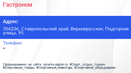 Гастроном по адресу 356236, Ставропольский край, Верхнерусское, Подгорная улица, 95 в дальнейшем Организация, размещена в следующих категориях: