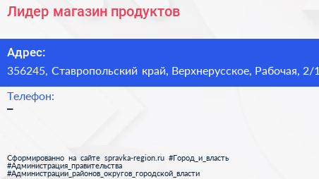 Лидер, магазин продуктов по адресу 356245, Ставропольский край, Верхнерусское, Рабочая, 2/1 в дальнейшем Организация, размещена в следующих категориях: