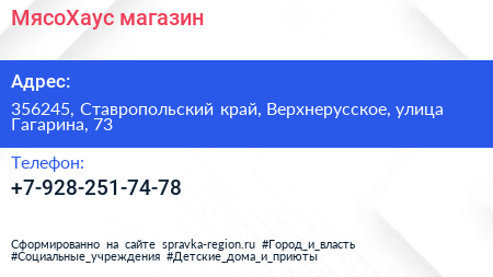 МясоХаус, магазин по адресу 356245, Ставропольский край, Верхнерусское, улица Гагарина, 73 в дальнейшем Организация, размещена в следующих категориях: