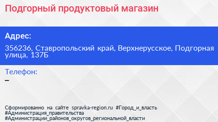Подгорный, продуктовый магазин по адресу 356236, Ставропольский край, Верхнерусское, Подгорная улица, 137Б в дальнейшем Организация, размещена в следующих категориях: