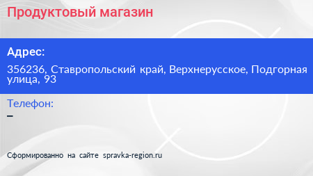Продуктовый магазин по адресу 356236, Ставропольский край, Верхнерусское, Подгорная улица, 93 в дальнейшем Организация, размещена в следующих категориях: