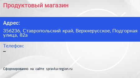 Продуктовый магазин по адресу 356236, Ставропольский край, Верхнерусское, Подгорная улица, 82а в дальнейшем Организация, размещена в следующих категориях: