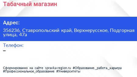 Табачный магазин по адресу 356236, Ставропольский край, Верхнерусское, Подгорная улица, 47а в дальнейшем Организация, размещена в следующих категориях: