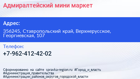 Адмиралтейский, мини-маркет по адресу 356245, Ставропольский край, Верхнерусское, Георгиевская, 107 в дальнейшем Организация, размещена в следующих категориях: