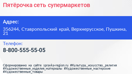 Пятёрочка, сеть супермаркетов по адресу 356244, Ставропольский край, Верхнерусское, Пушкина, 21 в дальнейшем Организация, размещена в следующих категориях: