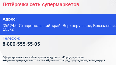 Пятёрочка, сеть супермаркетов по адресу 356245, Ставропольский край, Верхнерусское, Вокзальная, 105/2 в дальнейшем Организация, размещена в следующих категориях: