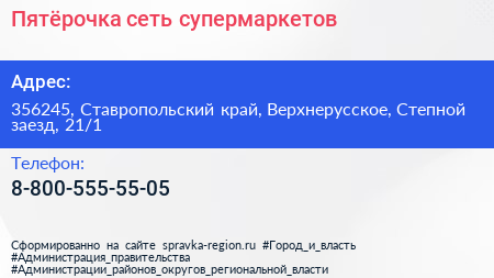 Пятёрочка, сеть супермаркетов по адресу 356245, Ставропольский край, Верхнерусское, Степной заезд, 21/1 в дальнейшем Организация, размещена в следующих категориях: