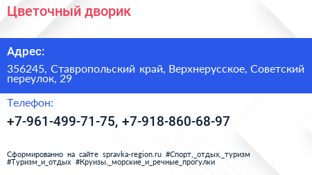Цветочный дворик по адресу 356245, Ставропольский край, Верхнерусское, Советский переулок, 29 в дальнейшем Организация, размещена в следующих категориях: