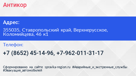 Антикор по адресу 355035, Ставропольский край, Верхнерусское, Коломийцева, 46 к1 в дальнейшем Организация, размещена в следующих категориях: