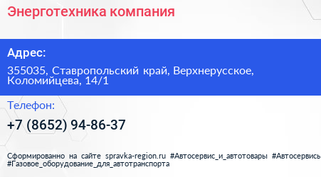 Энерготехника, компания по адресу 355035, Ставропольский край, Верхнерусское, Коломийцева, 14/1 в дальнейшем Организация, размещена в следующих категориях: