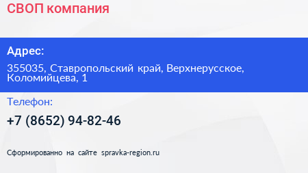 СВОП, компания по адресу 355035, Ставропольский край, Верхнерусское, Коломийцева, 1 в дальнейшем Организация, размещена в следующих категориях: