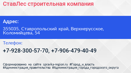 СтавЛес, строительная компания по адресу 355035, Ставропольский край, Верхнерусское, Коломийцева, 54 в дальнейшем Организация, размещена в следующих категориях: